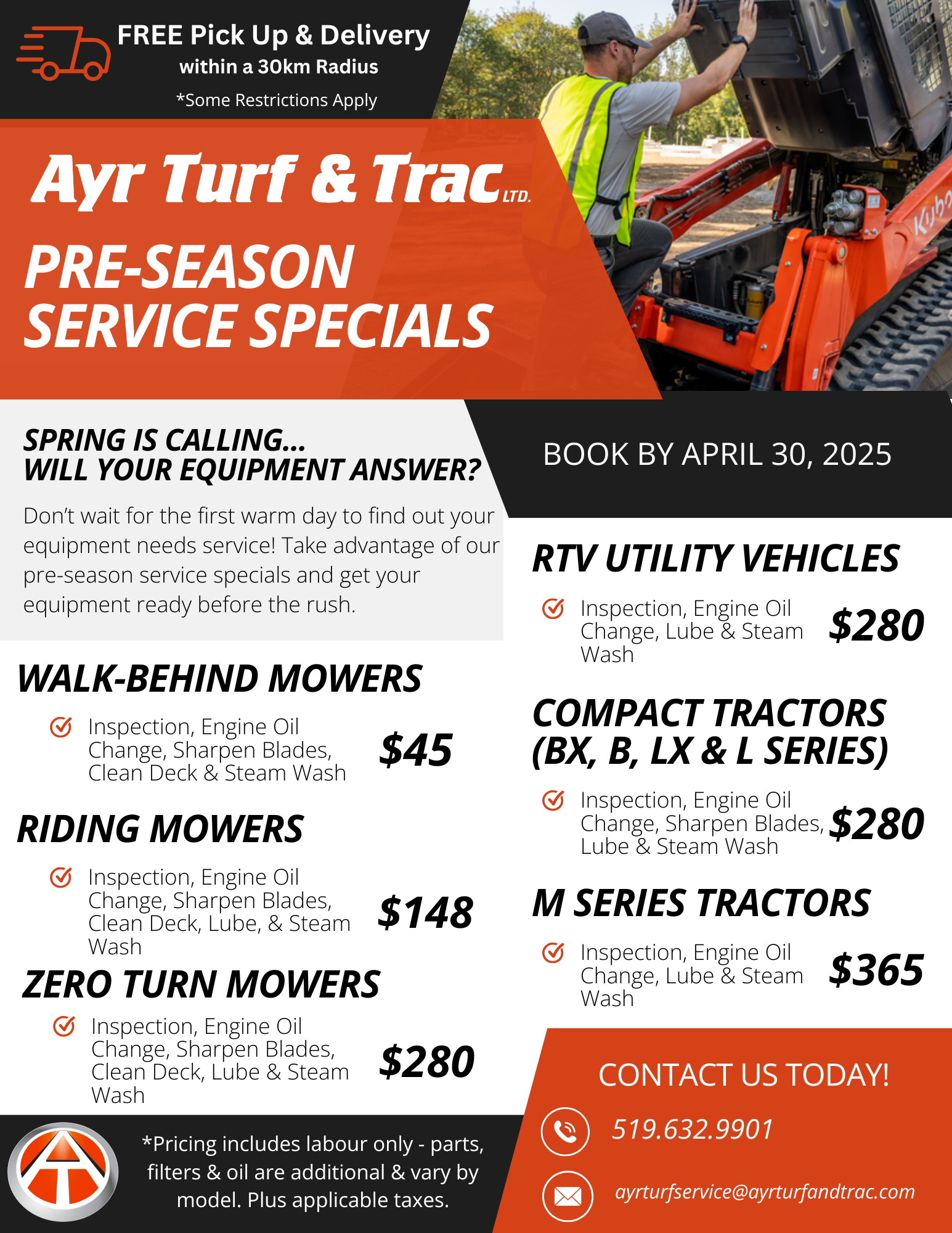 Our Pre-Season Service Specials are here from March 1, 2025 – April 30, 2025, and we’re making it even easier with FREE pickup & delivery within 30km on select models! Book Your Service
